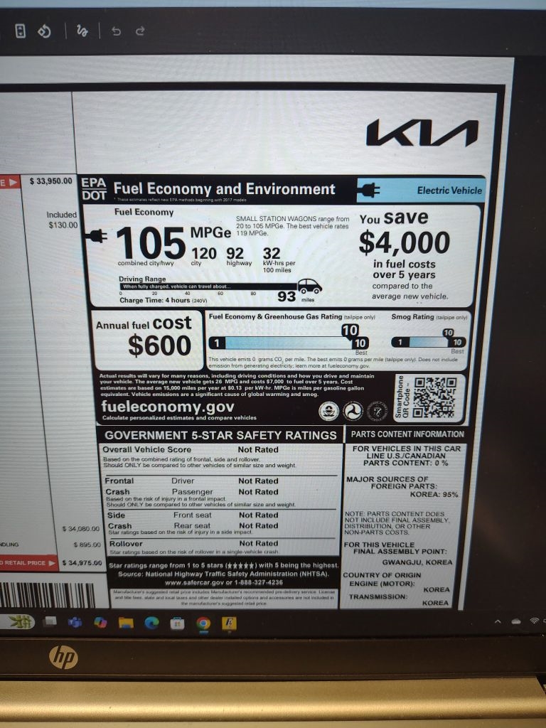 Fuel Economy: City 120/Hwy 92 Estimated By E.P.A. - Actual Mileage May Vary